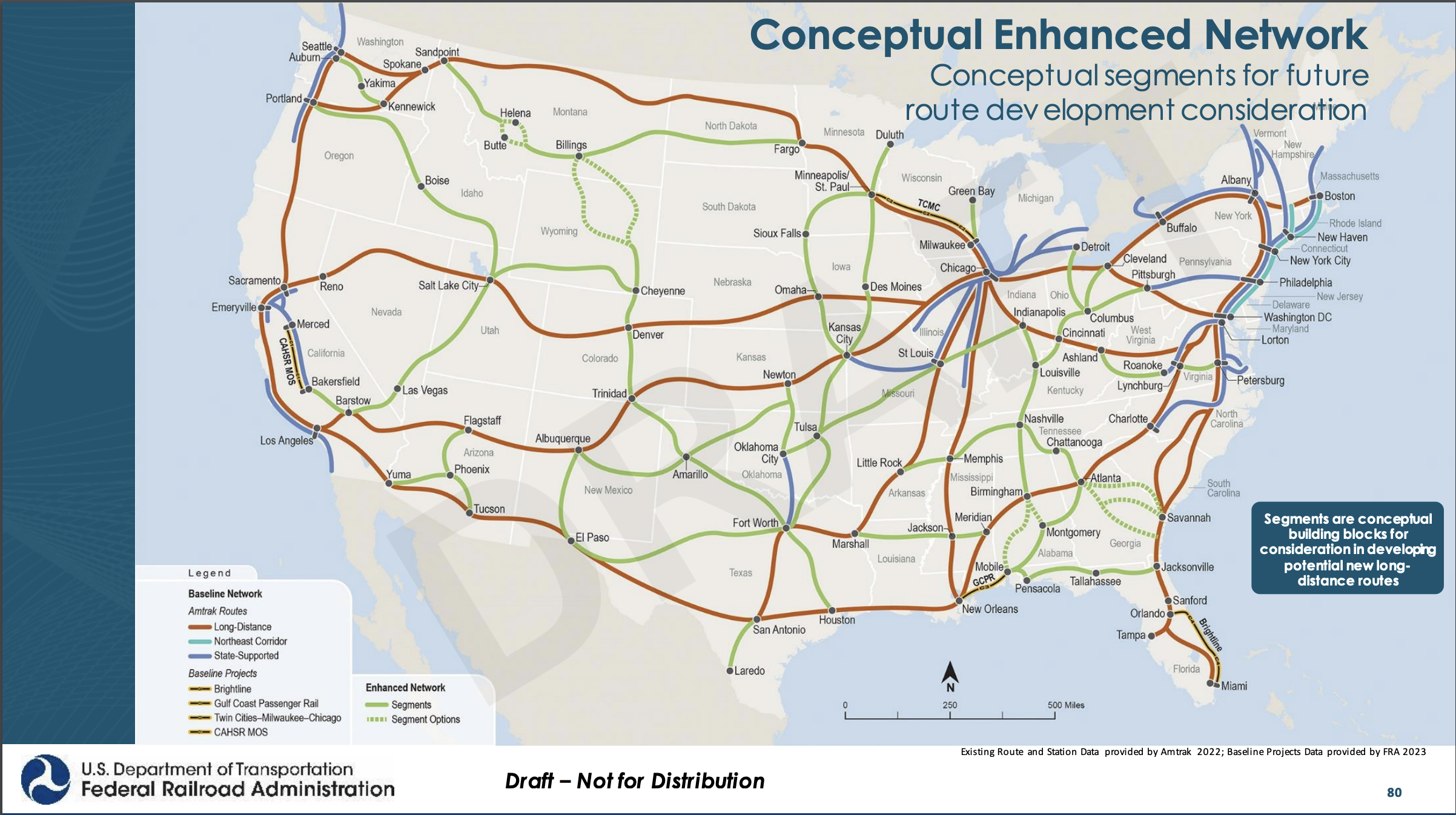 The regional working groups providing the Federal Railroad Administration with feedback on the FRA Amtrak Daily Long-Distance Service Study have published meeting summaries and maps of a “Conceptual Enhanced Network.”